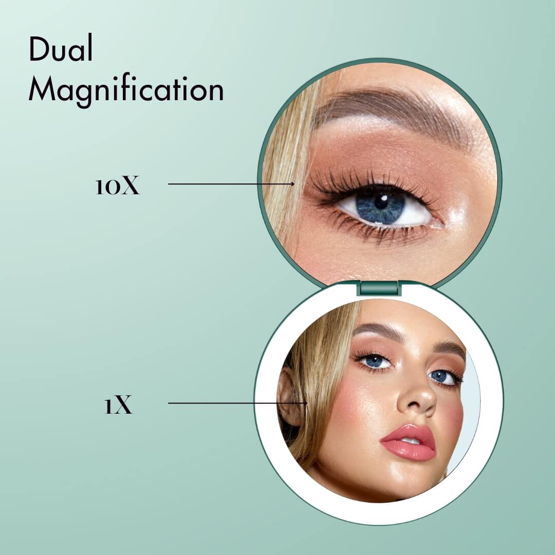 - Double-sided magnification (1x and 10x) so you can apply a full face of makeup, do a quick touch-up on the go, or focus on a detailed task like tweezing or inserting contact lenses.