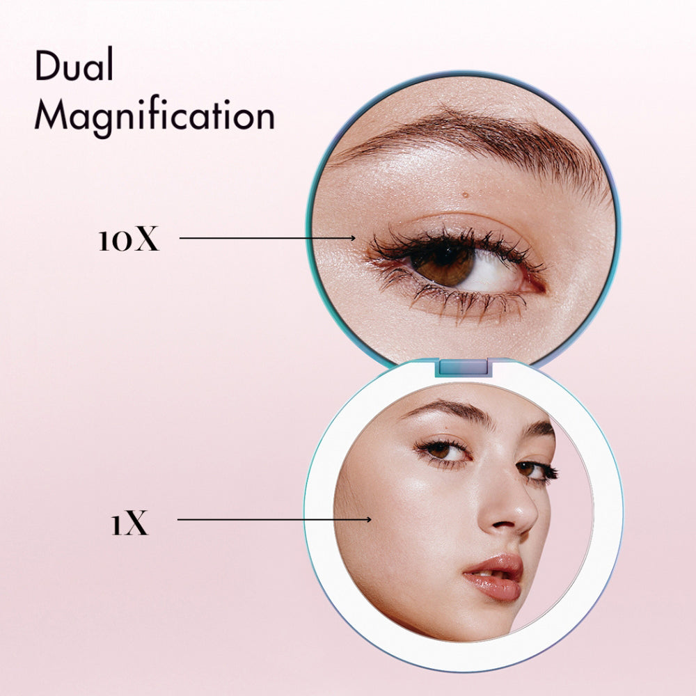 - Double-sided magnification (1x and 10x) so you can apply a full face of makeup, do a quick touch-up on the go, or focus on a detailed task like tweezing or inserting contact lenses