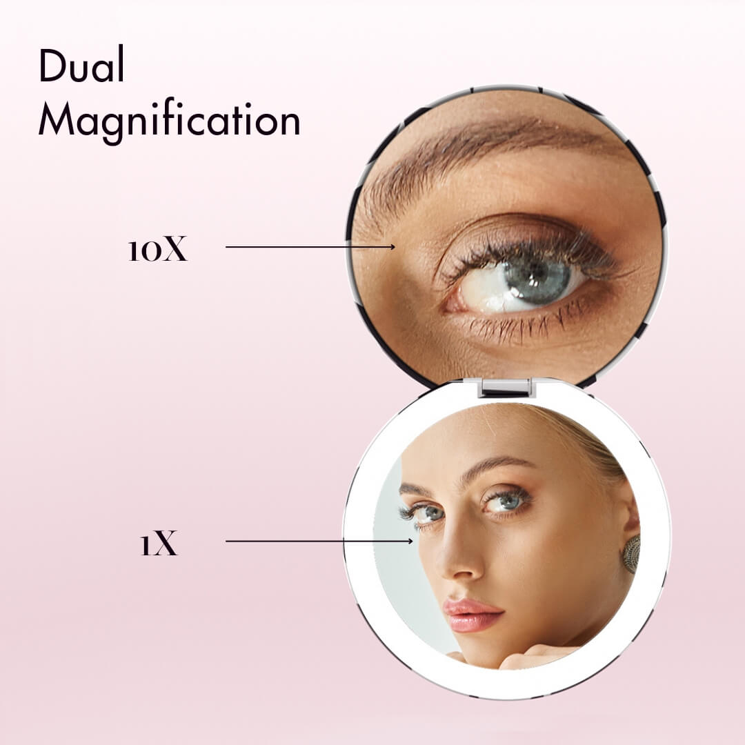 - Double-sided magnification (1x and 10x) so you can apply a full face of makeup, do a quick touch-up on the go, or focus on a detailed task like tweezing or inserting contact lenses.