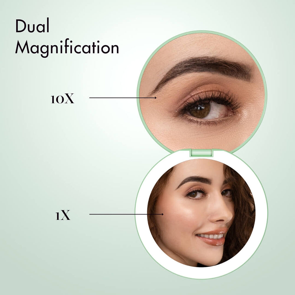 - Double-sided magnification (1x and 10x) so you can apply a full face of makeup, do a quick touch-up on the go, or focus on a detailed task like tweezing or inserting contact lenses.