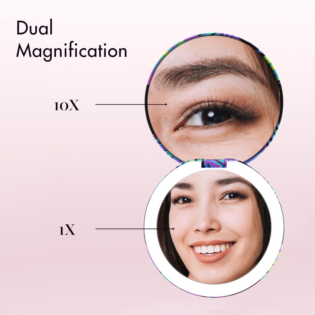 - Double-sided magnification (1x and 10x) so you can apply a full face of makeup, do a quick touch-up on the go, or focus on a detailed task like tweezing or inserting contact lenses
